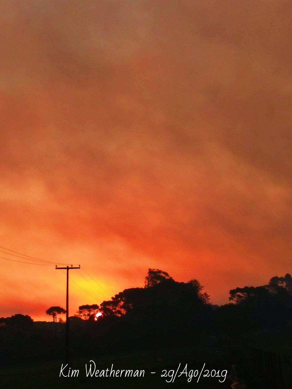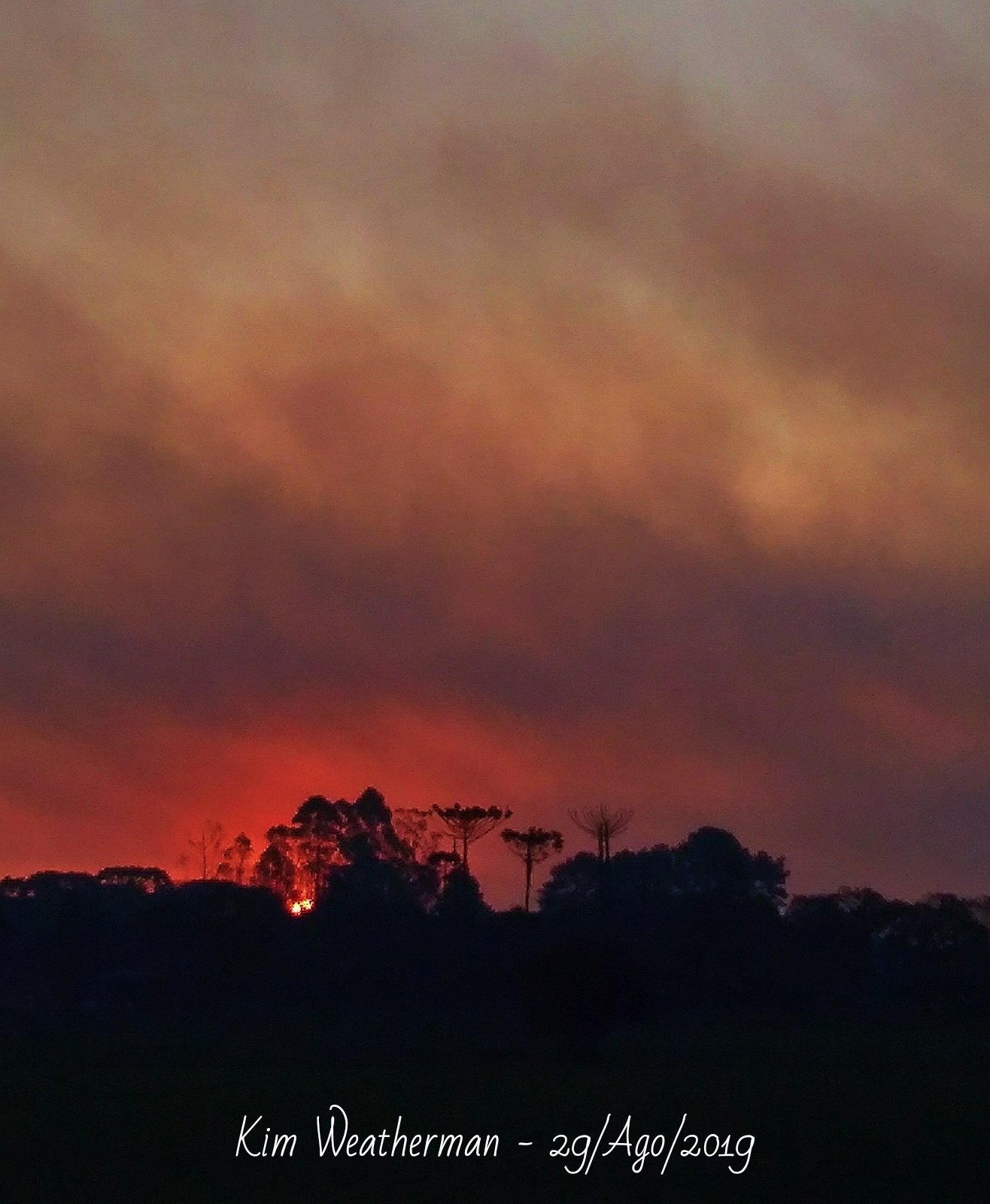 Carlos Campos Posted August 29, 2019 at 11:02 PM Share Posted August 29, 2019 at 11:02 PM Hoje sem dúvida foi o melhor dia da semana em termos de temperatura: variação entre 11/27°C na maior parte da região de Curitiba (já mencionado pelo Lucas). Céu limpo na parte da tarde e sol brilhando intensamente 👇 Ao entardecer, infelizmente um grande incêndio na mata ressecada ao leste produziu tanta fumaça e fuligem q o Sol simplesmente desapareceu às 17h. Olhando o céu, parecia q uma tempestade estava se aproximando. As imagens eu fiz por volta do poente, às 17h50 👇 A nuvem de fumaça tomou conta da vila e também das vilas próximas. Me arrependi (tarde demais) de ter saído de casa fazer as imagens... O ar estava quase irrespirável. A fumaça baixou até quase o nível do solo com a calmaria do entardecer. Então, como se fosse neve, as cinzas transportadas de longe começaram a descer lentamente... Agora a temperatura já está em queda rápida e atinge 13°C. 8 3 Link to comment Share on other sites More sharing options...