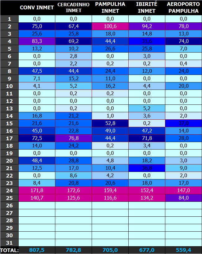 Rodolfo Alves Posted January 25, 2020 at 02:05 PM Share Posted January 25, 2020 at 02:05 PM ACUMULADOS DE CHUVA EM BELO HORIZONTE E REGIÃO EM JANEIRO ATÉ AQUI (Entre as 9:00 de cada dia) 8 Link to comment Share on other sites More sharing options...