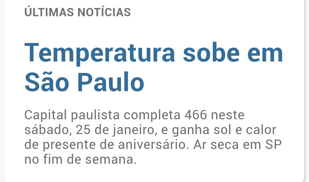 Juzinho Posted January 25, 2020 at 03:03 PM Share Posted January 25, 2020 at 03:03 PM 2 minutos atrás, Maicon disse: Manhã gelada em José Bonifácio-SP. INMET: 18.6°C CASA: 18.1°C. Hoje é aniversário de São Paulo, e a cidade ganhou um presentão. Vejam só a notícia: QUE PRESENTÃO EIM! Como estamos com sol e temperaturas mais amenas , até acho que foi um presente mesmo. Melhor do que ter temporais e a mídia vir com aquela velha ladainha ¨ SP ganha um novo ano , mas registra problemas antigos¨ hehe . SP com temperaturas entre 23 e 25 graus agora . 2 Link to comment Share on other sites More sharing options...