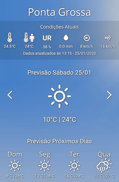 Felipe Backendorf Posted January 25, 2020 at 12:02 PM Share Posted January 25, 2020 at 12:02 PM Hoje tive meu recorde de mínima pra janeiro (2017-2020): 16,7C. Ontem o dia foi com predomínio de Sol e alguns momentos de chuva fraca/garoa, a temperatura variou entre 17,8C e 29,1C 7 Link to comment Share on other sites More sharing options...