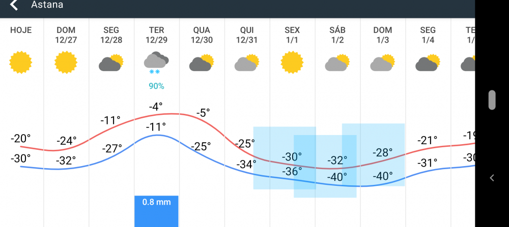 DaviOlrb Posted January 7, 2020 at 01:06 AM Share Posted January 7, 2020 at 01:06 AM O golfo pérsico, apesar da fornalha que é no verão, tem um inverno bem ameno. Aliás, a previsão do Europeu é de bastante chuva pra Dubai nos próximos dias com máximas baixas: E pro Kuwait, que costuma passar dos 50ºC no verão, a semana será fria: 5 Link to comment Share on other sites More sharing options...