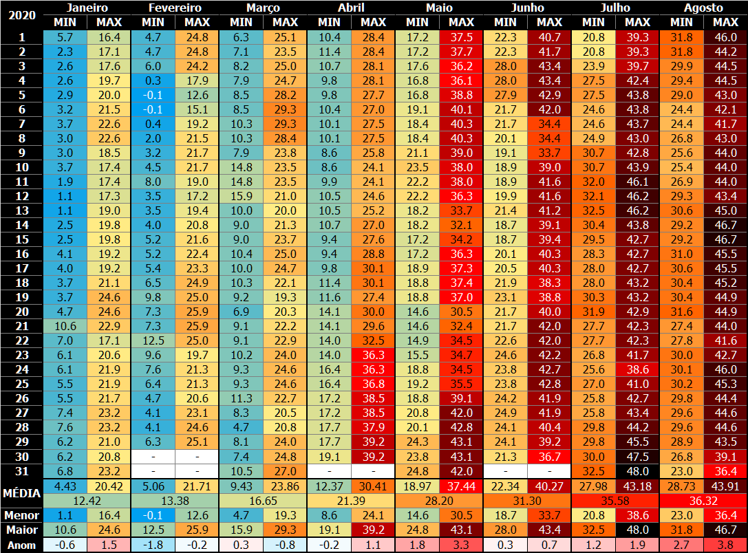 Leandro Leite Posted August 15, 2020 at 02:03 PM Share Posted August 15, 2020 at 02:03 PM (edited) Em 14/08/2020 em 09:08, Leandro Leite disse: A última máxima sub 40 foi em 23 de julho com 36 C, de lá pra cá a menor mínima foi 27 C no dia seguinte, nesse agosto a menor máxima foi 42 C, e ainda não baixou de 28 C, para os próximos 15 dias nenhuma máxima menor que 43 C, chegando a 46 C em alguns dias, e nenhuma mínima inferior a 31 C, Cuiabá não tem todo esse calor, mas na média é mais quente que Phoenix, graças ao inverno mais frio que não existe em Cuiabá, Phoenix não costuma chegar aos 30 C em fevereiro, equivalente a agosto em Cuiabá, quando não raramente registra 40 C.🔥🔥 Por falar em fevereiro, Phoenix chegou a 0 C este ano, mínima anual comum em Curitiba. Ontem deu 46 C, logo que escureceu, fazia 43 C, minutos antes das 11 da noite ainda fazia 41 C, baixando para 39 C minutos antes da meia noite, ninguém dore num lugar desses se não tiver ar condicionado 😲 Edited August 15, 2020 at 02:08 PM by Leandro Leite 1 Link to comment Share on other sites More sharing options...