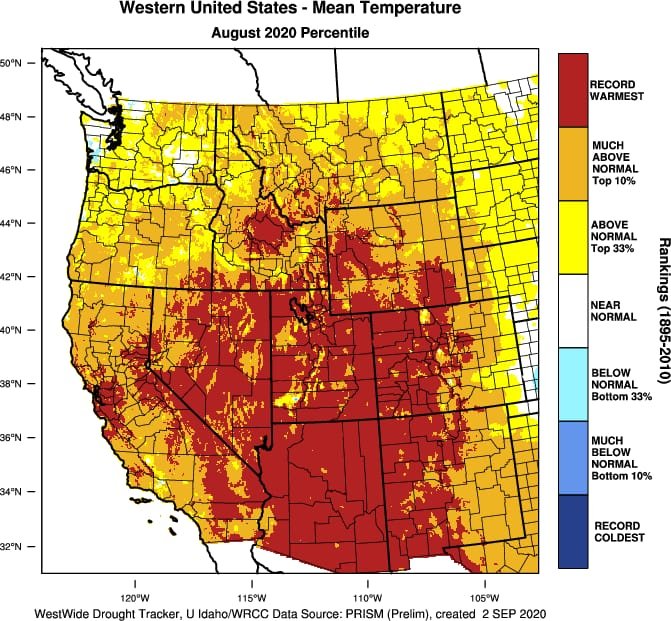 jean10lj Posted September 4, 2020 at 05:32 PM Share Posted September 4, 2020 at 05:32 PM (edited) Agosto 2020 foi o agosto mais quente dos registros nas áreas em vermelho: Em Phoenix, Arizona, que já é extremamente quente até num mês normal de primavera, não foi apenas o agosto mais quente, mas também o mês mais quente da história. Luke Air Force Base/Phoenix em 2020: Edited September 4, 2020 at 05:33 PM by jean10lj 7 3 Link to comment Share on other sites More sharing options...