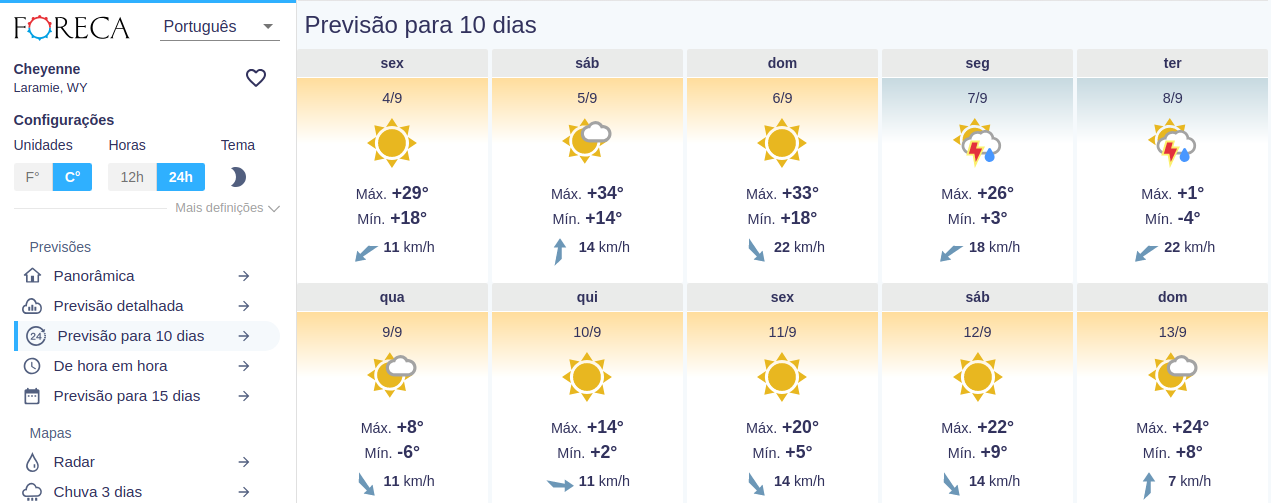 André Luiz DS Posted September 5, 2020 at 01:54 AM Share Posted September 5, 2020 at 01:54 AM Segundo o Foreca, a cidade de Cheyenne, capital do Wyoming, deve ter máxima de 33˚C no domingo, na terça-feira a máxima prevista é de apenas 1˚C: 4 Link to comment Share on other sites More sharing options...
