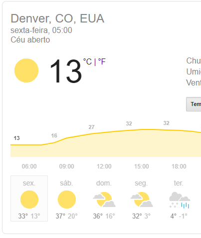 ricardosilva Posted September 7, 2020 at 05:04 PM Share Posted September 7, 2020 at 05:04 PM 18 horas atrás, Matheus Vinicius disse: Amplitude demoníaca em Denver, amanhã. Me espantei tanto que fui ver na previsão horária e parece que será um pouco menos assustador. Até a meia-noite a temperatura terá caído para cerca de 12ºC, já é uma grande queda...mas esses 1ºC só vai chegar por volta das 8:00 da manhã do dia seguinte, juntamente com a neve (isso é até relativamente comum por lá, lembro que vi num livro do Guiness Records que o recorde de maior queda de temperatura salvo engano foi registrado em Montana, e foi algo como 50º graus a menos de um dia para o outro). Ainda assim, surreal e completamente fora de qualquer comparação com o Brasil. 3 Link to comment Share on other sites More sharing options...