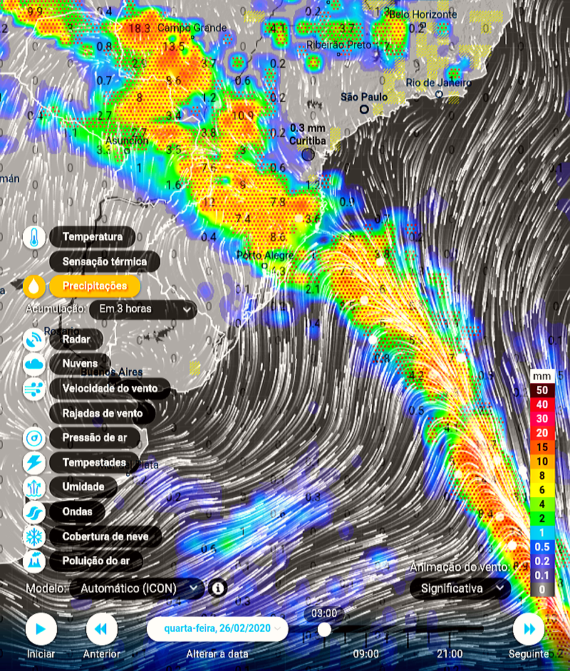 Lucas Centurion Posted February 26, 2020 at 02:43 AM Share Posted February 26, 2020 at 02:43 AM (edited) Fevereiro terminando de forma fantástica!! Modelo WRF - Que fevereiro é esse Temperatura confesso um pouco abafada, de 22,8ºC, em razão dessa pré-frontal típica sobre o interior de SP. Céu totalmente nublado! Mas com a chuva que está prevendo já nessa madruga e principalmente amanha de tarde o refresco deve voltar e daí devemos ter dias bem mais amenos, e só deve ter chance de chuva no domingo. Alerta para MG que deve ter bastante chuva nos próximos dias. Hoje foi dia de chuvarada no oeste e centro sul paulista, norte do PR e MS. Em Presidente Prudente choveu bastante hoje, causando alagamentos. Na automática do INMet até as 23z acumulou 57,2mm. https://g1.globo.com/sp/presidente-prudente-regiao/noticia/2020/02/25/chuva-forte-provoca-alagamentos-e-agua-invade-residencias-em-presidente-prudente.ghtml Edited February 26, 2020 at 02:48 AM by Lucas Centurion 6 Link to comment Share on other sites More sharing options...