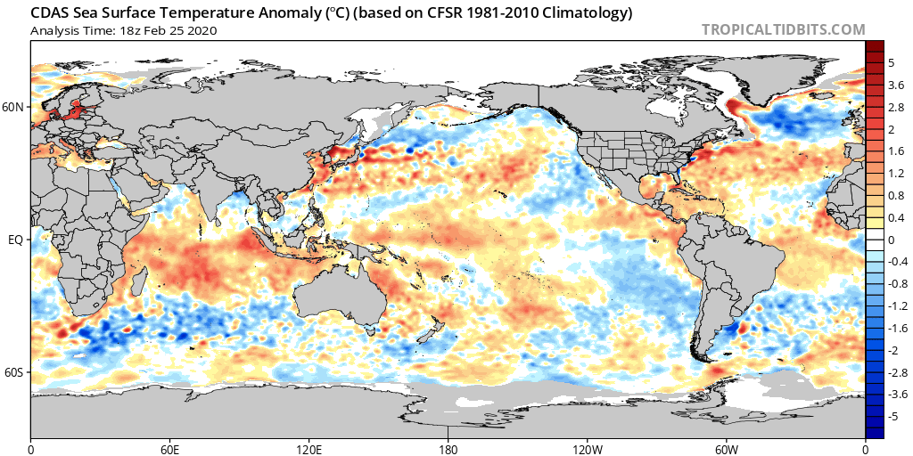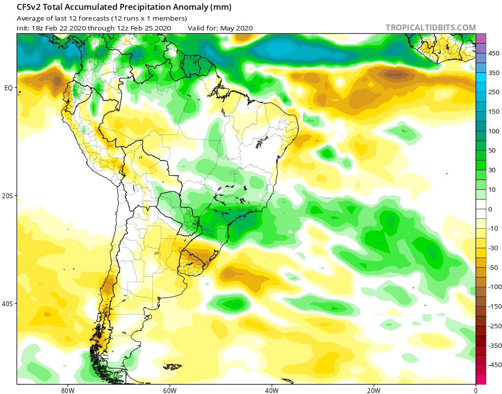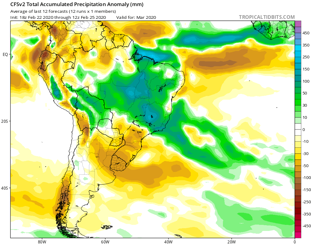 Pedro Victor P. Posted February 26, 2020 at 02:33 AM Share Posted February 26, 2020 at 02:33 AM (edited) Se fevereiro tem se mostrado predominantemente positivo no norte do Nordeste, as notícias para o resto da quadra chuvosa, segundo o CFSv2, não são lá muito animadoras: Março ainda deverá ter desvios positivos, mas num grau muito menor em relação ao que era previsto nas rodadas de dezembro/janeiro: Em abril (que em Fortaleza é o mês mais chuvoso do ano, com média de 412,8 mm), grande parte da região tende a apresentar desvios negativos, enquanto o Amapá e o Pará terão desvios positivos, o que provavelmente indica que a ZCIT deverá ficar mais pra lá do que pra cá. E por fim, maio, também seguindo a tendência de apresentar desvios negativos por toda a metade norte do Nordeste: Situação atual dos oceanos: Edited February 26, 2020 at 02:34 AM by Pedro Victor P. 7 1 Link to comment Share on other sites More sharing options...