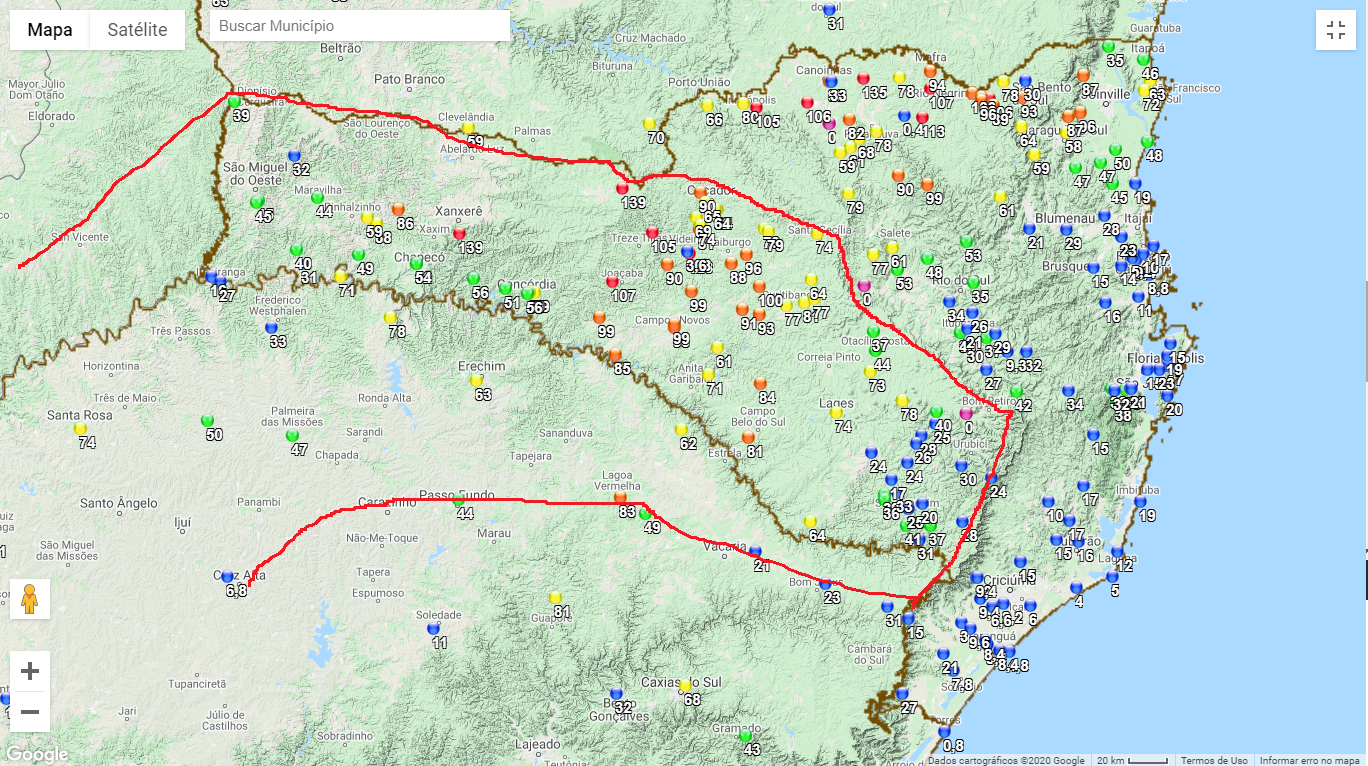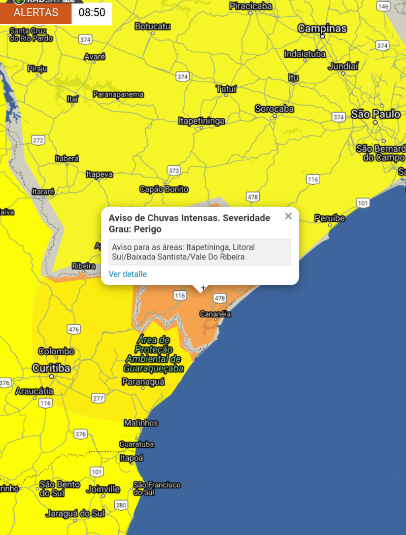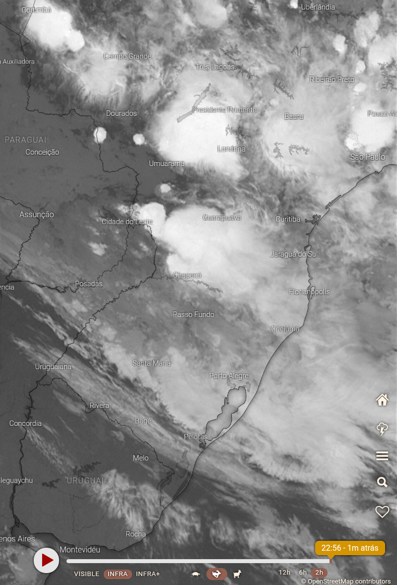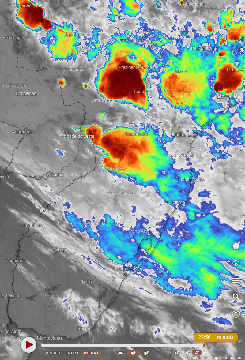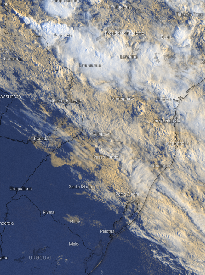 Carlos Campos Posted February 26, 2020 at 12:27 PM Share Posted February 26, 2020 at 12:27 PM Bom dia à todos... feriado terminando com chuvas intermitentes em boa parte do Sul, com grandes acumulados no estado catarinense, em áreas específicas da metade norte/leste do Rio Grande do Sul e em boa parte do sul e sudoeste do Paraná. Os maiores volumes foram registrados em Santa Catarina, superando os 100 mm em algumas estações (Joaçaba, Xanxerê, Rio Negrinho, etc, já apresentado no mapa pelo @Felipe Backendorf). Aki na região de Curitiba os acumulados foram pekenos devido à característica das precipitações, em geral fracas e contínuas. Acumulado <25 mm entre ontem e hoje. Apenas no extremo sul da região metropolitana houve um volume razoável em torno dos 40-50 mm. Imagem desta manhã, com o grosso da nebulosidade já adentrando o Sudeste do país mas ainda atuando principalmente no interior do Paraná ⬇ Aviso de intensas precipitações no extremo sul de São Paulo nas próximas horas (aviso semelhante também emitido para boa parte do Centro-Oeste e áreas do Norte do país): 6 Link to comment Share on other sites More sharing options...