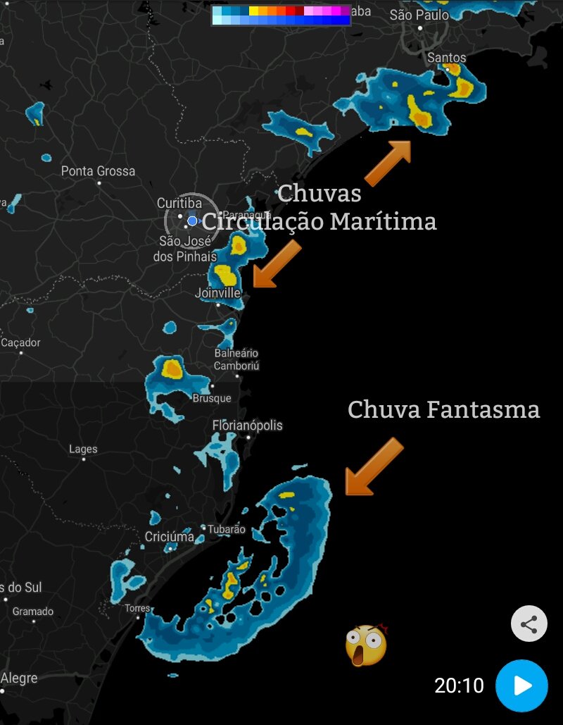 Carlos Campos Posted February 4, 2020 at 11:29 PM Share Posted February 4, 2020 at 11:29 PM Muita umidade e ventos soprando do oceano estão provocando chuvas moderadas e até fortes na costa, desde o litoral paulista até o catarinense. Na região entre Joinville e o leste do Paraná, as chuvas mais volumosas se concentram nas áreas serranas, justamente pelo efeito da subida dos ventos úmidos em direção ao planalto. 10 Link to comment Share on other sites More sharing options...