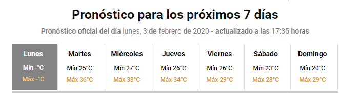 Rafael Rezende de loyola Posted February 4, 2020 at 07:22 PM Share Posted February 4, 2020 at 07:22 PM 17 horas atrás, Fábio De Nittis disse: Boa noite! Ontem e hoje foram dias ensolarados em Buenos Aires e de bastante calor. Ontem a mínima foi de 21,6°C e a máxima de 34,5°C. Hoje mínima de 25,4°C, a maior em quase um ano, e máxima de 35°C. Segue terrivel agora, com 29°C, com sensacao de 31,5°C. Mas VAI PIORAR. Essa é a previsao do SMN pros próximos dias: Caso se confirme a previsao, SERIAM CINCO DIAS SEGUIDOS DE MÍNIMAS DE 25-27°C. Acho que seria algo inédito aqui! Vamos ver se se confirma, porque o tempo estará instável a partir de quarta e alguma pancada de chuva poderia mudar essa situacao. Credo.Por que está tão quente ai? Pelo que vejo nos seus posts, Buenos Aires FERVE em Janeiro e Fevereiro. Dai em março começa a amenizar bem. Estou certo? 1 Link to comment Share on other sites More sharing options...
