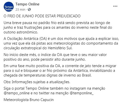 Felipe S Monteiro Posted June 9, 2020 at 09:17 PM Share Posted June 9, 2020 at 09:17 PM 16 minutos atrás, fernandosant disse: Por mim, que junho tenha um mega bloqueio, e nos últimos dias do mês venha uma bomba como abril de 2016, quebrando o bloqueio no dia 28, transformando julho, agosto e um pedaço de setembro num FREEZER. Vou me iludir aqui e aproveitar o calor no RJ... as areias das praias estão liberadas, que coincidencia, não? Hoje aqui anomalia de temperatura ficou em +9° na mínima e +8° na máxima, pelas previsões seriam mais de duas semanas no mesmo ritmo, pra compensar isso tem que ser um frio muito absurdo, estou descrente que vai haver uma recompensa depois, e se houver, não vai ser nada histórico como vai ser essa onda de calor, talvez no Rio até seja recompensado a altura, mas aqui vai ser o que eu acabei de falar. 1 2 Link to comment Share on other sites More sharing options...