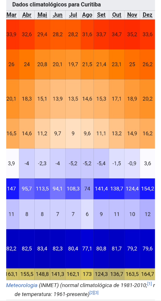 ricardosilva Posted June 9, 2020 at 08:18 PM Share Posted June 9, 2020 at 08:18 PM 2 horas atrás, Felipe Backendorf disse: realmente, Curitiba é mais fria Esses dados de Curitiba deste gráfico estão corretos? São de estação oficial do INMET/SIMEPAR? Podia jurar que a mínima média em Julho é sub-10. 4 Link to comment Share on other sites More sharing options...