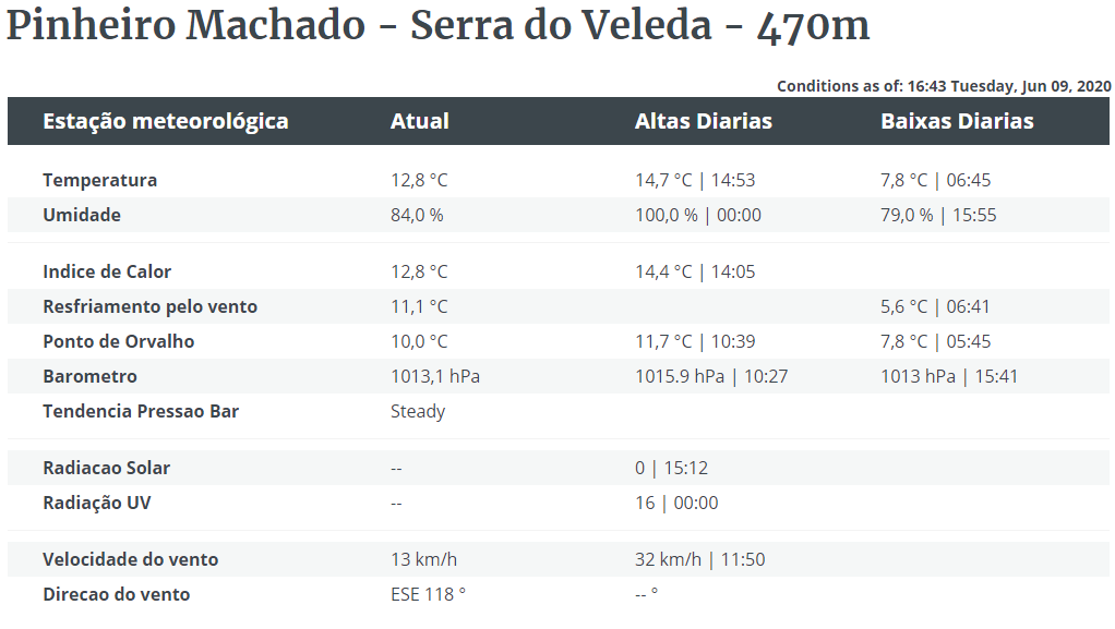Carlos Campos Posted June 9, 2020 at 09:31 PM Share Posted June 9, 2020 at 09:31 PM Áreas de chuva continuam avançando sobre a região de Curitiba e inclusive voltou a chover aki em Piraquara há uns 40 min: Nevoeiros foram predominantes em quase toda a área serrana do nordeste gaúcho e durante praticamente todo o dia em algumas localidades e pontos elevados de outras localidades. Em Vacaria um forte nevoeiro cobriu a cidade até por volta das 11h30 e após o meio dia houve chuva forte em áreas do município. Nas duas estações do município os acumulados ultrapassaram 20 mm, mas ambas as estações estão localizadas à leste/nordeste da cidade e foi nesses setores que ocorreram precipitações, pelo que observei na animação do radar. No oeste do município provavelmente não houve acumulado algum. As áreas de instabilidade e as grandes formações foram geradas à partir do centro-norte e nordeste do estado e avançaram por Santa Catarina e Paraná. À título de curiosidade, Junho/2020 em Vacaria (estação INMET): Vacaria, estação Basf: Acumulado de 26,9 mm. No Inmet 22,0 mm Localizada no interior do município, a mínima atingiu -3,0°C. No Inmet a mínima no mesmo dia ficou em 0,0°C. Em Bom Jesus, o acumulado hoje atingiu 7,1 mm e a mínima absoluta foi de -1,8°C no dia 3/6. Até o momento, máxima de 20,9°C em Bom Jesus Basf e 20,0°C em Vacaria INMET. Um mês bastante suave até o momento na região. Outros pontos que registraram densos nevoeiros em altitude hoje: Sapiranga, com raros momentos de visibilidade nos topos: Teutônia, com "mar de nuvens" visto do Morro das Antenas pela manhã e visibilidade quase zero durante a tarde: 14 1 Link to comment Share on other sites More sharing options...