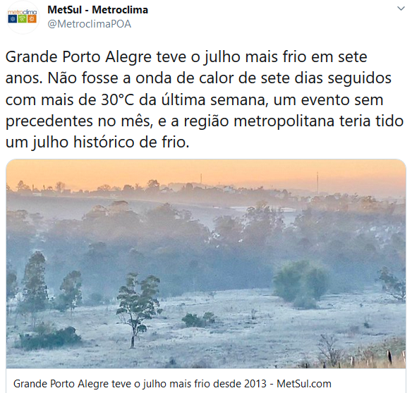 Guest Eclipse Posted July 25, 2020 at 09:08 PM Share Posted July 25, 2020 at 09:08 PM Esse inverno parece estar pegando gosto por veranicos prolongados POA: Link to comment Share on other sites More sharing options...