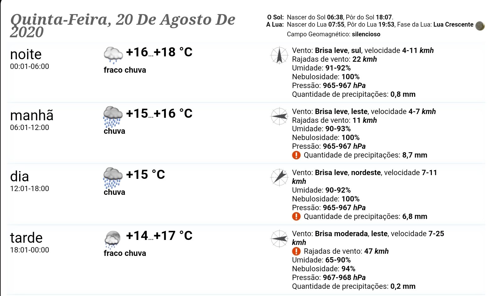 Rafael MG Posted August 11, 2020 at 04:57 PM Share Posted August 11, 2020 at 04:57 PM 13 minutos atrás, LeoP disse: Pra ficar gravada a previsão, tanto de dias gelados e quanto da queda muito acentuada da temperatura, algo pouco comum por aqui. Belo Horizonte - MG Seria uma repetição de agosto de 1999, quando BH teve máxima de 13 graus numa segunda, após ter chegado a 29 no sábado e 24 no domingo (No domingo em que isso aconteceu, eu estava perto de Ouro Preto, no distrito de Lavras Novas (quase a 1.400 metros de altitude), e a temperatura ficou na casa dos 10 graus o dia todo. 9 Link to comment Share on other sites More sharing options...