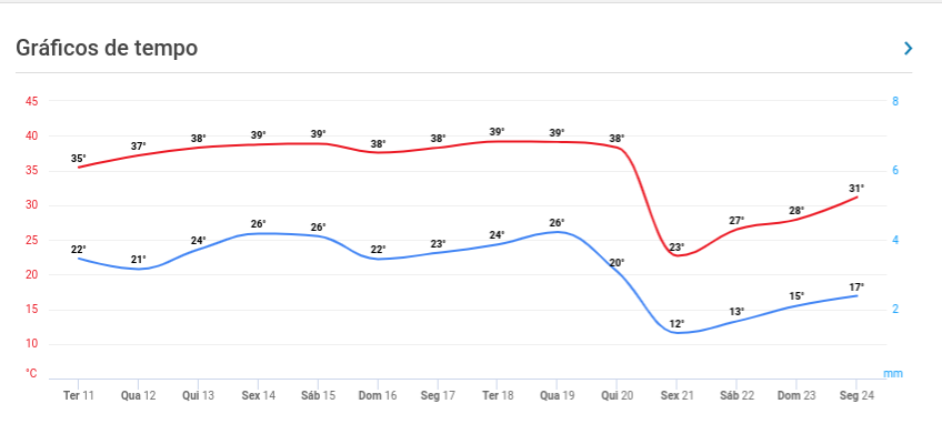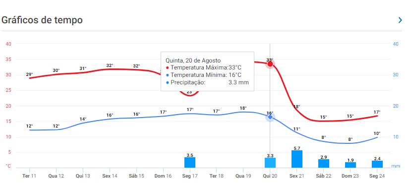 pedro fioravante Posted August 11, 2020 at 02:24 AM Share Posted August 11, 2020 at 02:24 AM 27 minutos atrás, Daniel85 disse: Previsão para São Paulo para os próximos 10/14 dias Europeu 12z (tempo.com e Foreca) passou a indicar um pico de calor para a terça feira da semana que vem, dia 18 de agosto. Para a segunda metade desta semana, as máximas poderão passar dos 30 graus. Foreca - 10 dias Tempo.com - 14 dias Meteoblue - 14 dias Como de costume, desconsiderando o forte resfriamento previsto no médio prazo. As mínimas e o volume de chuva pioraram e muito. Aqui pro bairro onde mora na zona norte de São Paulo estava dando 5 dias com mínimas abaixo dos 10ºC sendo duas delas mínimas de 5ºC. Definitivamente esse não é um ano bom em relação ao inverno pra São Paulo. Joguei a toalha já 2 2 5 Link to comment Share on other sites More sharing options...