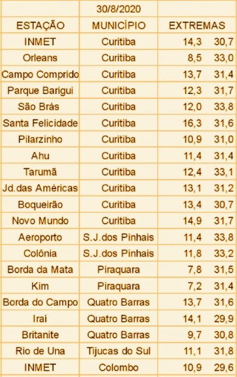 Moretão Posted August 16, 2020 at 02:49 PM Share Posted August 16, 2020 at 02:49 PM Mínimas: -3,1°C - Pinheiro Machado/Curral de Pedras -2°C - Quaraí -1°C - Santana do Livramento/RCC -0,4°C - Herval/Chácara J. Bubols -0,3°C - Dom Pedrito 14 1 Link to comment Share on other sites More sharing options...