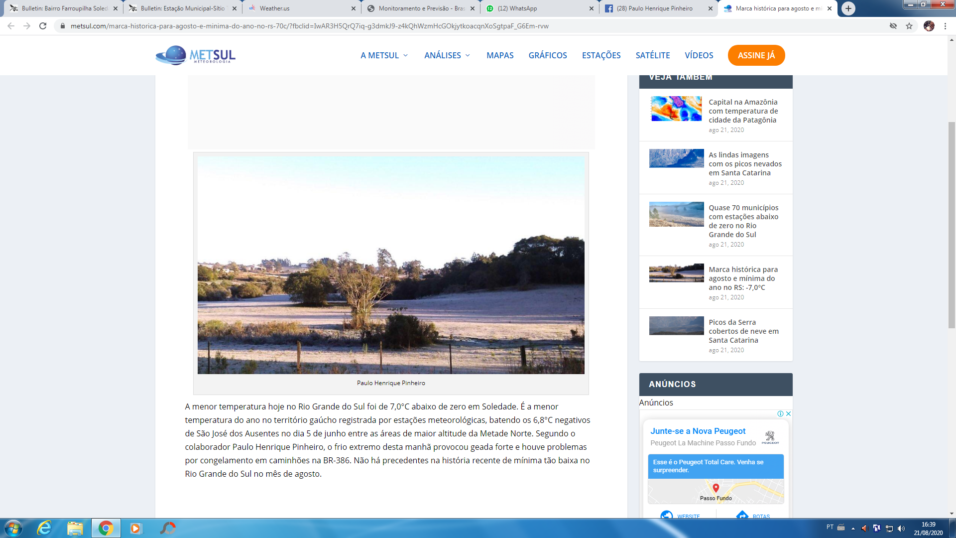 A.Carlos Posted August 21, 2020 at 06:32 PM Share Posted August 21, 2020 at 06:32 PM Boa tarde! São Paulo, às 15 horas: - CETESB PICO DO JARAGUÁ: 6,9℃ - CGE PARELHEIROS: 7,6℃ - CGE CAPELA DO SOCORRO: 7,7℃ - CGE MARSILAC: 8,1℃ (13h10) - CGE LAPA: 8,6℃ - CGE PINHEIROS: 8,7℃ - CGE JABAQUARA: 8,9℃ - CGE SÃO MATEUS: 9,0℃ - CGE SANTANA: 9,3℃ - INMET SESC: 8,7℃ - INMET MIRANTE: 9,3℃ - IAG: 9,4℃ O registro dos 6,9℃ na estação do PICO DO JARAGUÁ, no horário das 15 horas, supera os 8,7℃ registrados às 15 horas do dia 04/08/19. O registro dos 9,3℃ no MIRANTE, no horário das 15 horas, supera os 9,9℃ registrados às 15 horas do dia 18/07/2017. 16 1 Link to comment Share on other sites More sharing options...