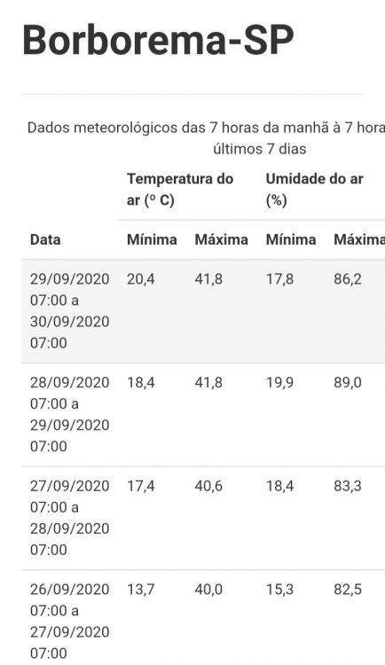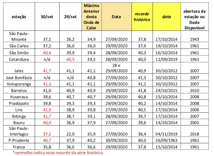 Darley Posted September 25, 2020 at 10:48 AM Share Posted September 25, 2020 at 10:48 AM Foreca prevendo 37°C de máxima São Paulo na próxima semana. Se isso confirmar, o Mirante poderá ter uma das maiores temperaturas de sua história. A marca de 37°C só foi superada apenas duas vezes (nas ondas de calor de janeiro de 1999 e de outubro de 2014). No ano passado o Mirante registrou a maior temperatura desde aquele calorão de fevereiro de 2015. 7 2 Link to comment Share on other sites More sharing options...