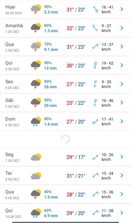 Guest Eclipse Posted November 19, 2020 at 01:04 PM Share Posted November 19, 2020 at 01:04 PM A quarta-feira foi agradável em POA, com céu mais cinza pela manhã, mas abrindo e ficando mais e mais bonito ao longo da tarde. A mínima de 13,8 °C foi muito boa para Novembro (apesar de não ser raro, e já tivemos mínimas ainda melhores recentemente, como em nov. de 2016, também sob La Niña). A máxima de 24,4 °C também foi um pouco abaixo da média, mas os raios solares já estão bem ardidos em função da proximidade cada vez maior do solstício de verão. Isso foi muito bem percebido no decorrer da tarde de ontem, que, apesar de permanecido boa parte das horas entre 21 °C e 24 °C, a partir do momento em que abriu mais o céu deu para sentir certo desconforto (calorzinho no lombo), apesar das temperaturas amenas para a época. A quarta-feira da próxima semana não promete ser tão generosa como foi ontem: E a MetSul já mandou o recado: Link to comment Share on other sites More sharing options...