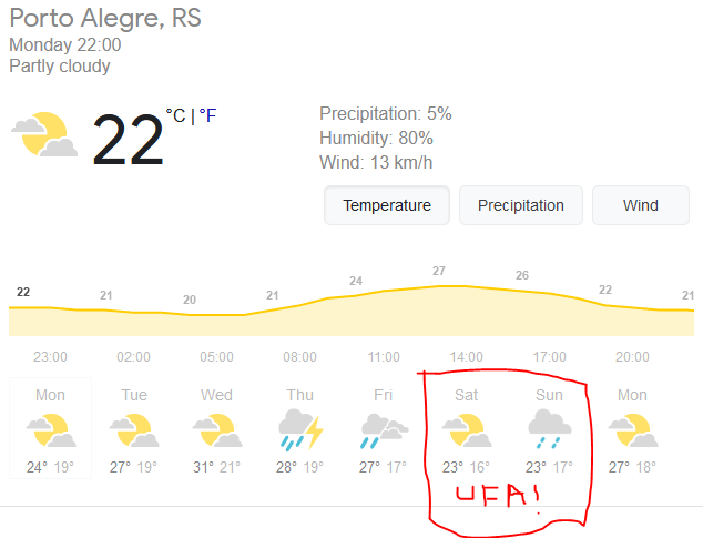 Renan Posted November 19, 2020 at 01:35 PM Share Posted November 19, 2020 at 01:35 PM 31 minutos atrás, Eclipse disse: A quarta-feira foi agradável em POA, com céu mais cinza pela manhã, mas abrindo e ficando mais e mais bonito ao longo da tarde. A mínima de 13,8 °C foi muito boa para Novembro (apesar de não ser raro, e já tivemos mínimas ainda melhores recentemente, como em nov. de 2016, também sob La Niña). A máxima de 24,4 °C também foi um pouco abaixo da média, mas os raios solares já estão bem ardidos em função da proximidade cada vez maior do solstício de verão. Isso foi muito bem percebido no decorrer da tarde de ontem, que, apesar de permanecido boa parte das horas entre 21 °C e 24 °C, a partir do momento em que abriu mais o céu deu para sentir certo desconforto (calorzinho no lombo), apesar das temperaturas amenas para a época. A quarta-feira da próxima semana não promete ser tão generosa como foi ontem: E a MetSul já mandou o recado: Na verdade, pelo que estou vendo, Porto Alegre corre sérios riscos de entrar lindamente no verão climático a partir da semana que vem. Calor constante de Quarta em diante, apesar das variações normais. Mínimas também altas. Enfim, não há nada que se possa fazer. Por aqui, espera-se uma drástica diminuição da precipitação na semana que vem. De fato, poderemos ficar uns bons dias sem chuva, com temperaturas um pouco elevadas (mas sem onda de calor). 8 2 Link to comment Share on other sites More sharing options...