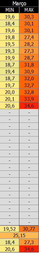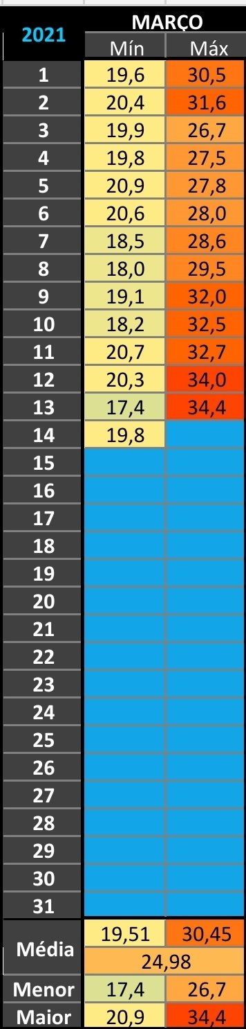Renan Posted March 15, 2021 at 11:54 AM Share Posted March 15, 2021 at 11:54 AM 8 horas atrás, Renan disse: E a noite está com temperatura extremamente aprazível, minha estação acusa ótimos 17,2°C e acredito que possa chegar a uns 15°C se continuar nesse ritmo. Confesso que estou surpreso. Dito e feito ! Nova mínima do ano até o momento, e menor mínima do verão: 15,3°C. A primeira sub-15 de 2021 está próxima, hehehe. 12 Link to comment Share on other sites More sharing options...