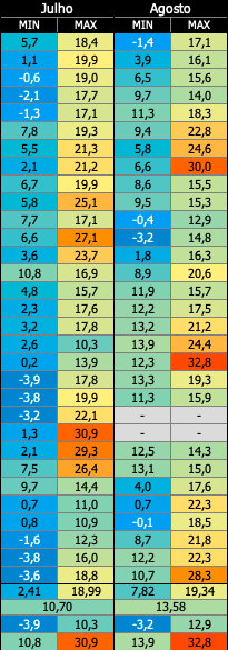 Victor Naia Posted August 22, 2021 at 05:10 PM Share Posted August 22, 2021 at 05:10 PM (edited) Sobre o debate se o inverno deste ano até o momento pode ser considerado histórico ou não para algumas regiões etc, trago alguns dados para ilustrar. Em Londrina, no período compreendido entre 28/06 até 03/08 (37 dias), as médias da estação do IAPAR foram de: 7,46/22,1°C. Na PWS localizada no distrito de Lerroville, as médias foram as seguintes no mesmo período: 5,7/21,17°C Acredito que em Julho de 2000 as médias foram melhores. Não sei se o período entre meados de julho até agosto de 2013 também fez mais frio. Acho que o período citado foi mais frio que outros anos com mais de 1 massa polar forte, como 2011, 2016 etc. Edited August 22, 2021 at 05:59 PM by Victor Naia 12 Link to comment Share on other sites More sharing options...