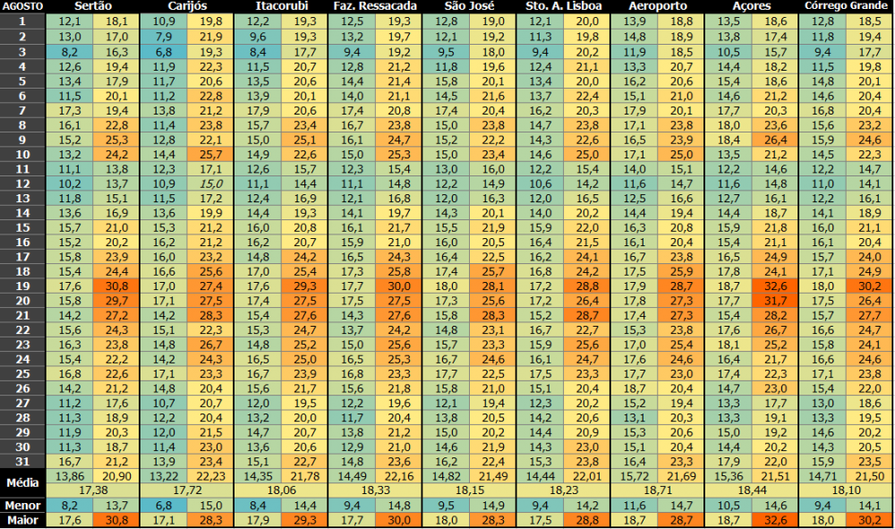Aldo Santos Posted August 22, 2021 at 01:54 AM Share Posted August 22, 2021 at 01:54 AM Ficou um pouco mais difícil do Mirante bater o recorde de agosto de 2010, que teve 6 dias seguidos com temperaturas de 30°C ou mais. Depois de 4 dias seguidos acima dos 30°C, hoje a sequência foi quebrada. No resto, continua tudo igual: Em 19/08/2021 em 18:43, Aldo Santos disse: Na cidade de São Paulo, mais do mesmo: sol, céu sem nuvens, névoa seca e calor. A umidade relativa ficou abaixo de 20% nas horas mais quentes do dia na maioria das estações do CGE e no Mirante. Mirante (Aut): 16,6°C / 29,2°C Mirante (Conv): 16,8°C / 29,3°C Interlagos: 13,9°C / 27,6°C IAG: 12,6°C / 30,0°C Áreas da zona sul mais próximas da serra do Mar tiveram entrada de brisa marítima à tarde. O que freou uma elevação maior das temperaturas, caso de Interlagos. 18 2 Link to comment Share on other sites More sharing options...