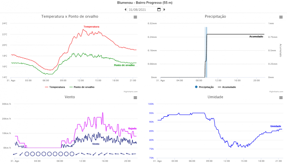 Carlos Campos Posted August 22, 2021 at 02:53 PM Share Posted August 22, 2021 at 02:53 PM Bom dia/tarde... Mesma situação observada ontem, com névoa um pouco mais forte e o Sol se insinuando entre fumaças e névoas. Mínima 7,5°C no abrigo e 2,2°C na relva. 7h com 7,6°C 👇 Depois de verificar os registros na baixada, levei a estação até uma pekena elevação de uns 6 metros aproximadamente (em relação à baixada). Sensores subiram então para 9,9/10,0°C. Uma diferença de +2,4°C mas a sensação era de algo mais do q isso. Agora, 11h55 já estamos com 26,2°C e 45% de URA com vento norte fresco e moderado. Céu limpo, fosco. 17 4 Link to comment Share on other sites More sharing options...
