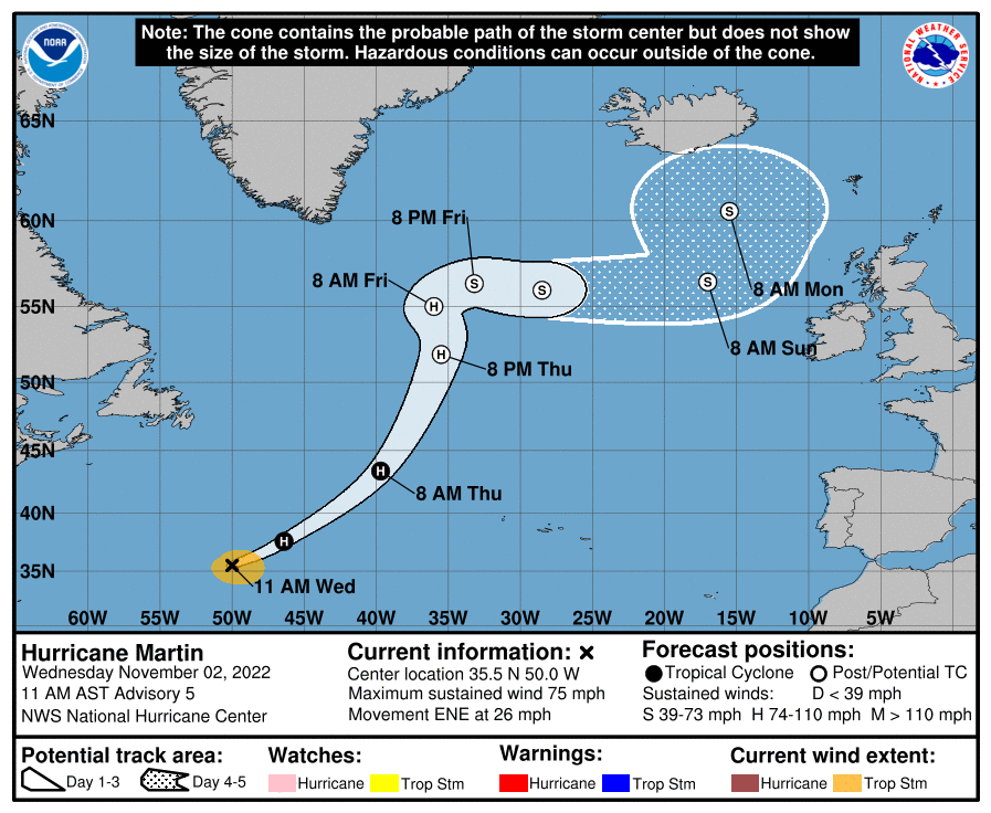 André L P Souza Posted June 5, 2022 at 02:31 PM Share Posted June 5, 2022 at 02:31 PM Depois de muita demora e lentidão da NOAA, finalmente Alex se formou. Confiram o aviso da agência: 000 WTNT31 KNHC 051157 TCPAT1 BOLETIM Tempestade Tropical Alex Intermediário Consultivo Número 11A NWS National Hurricane Center Miami FL AL012022 08:00 EDT dom 05 de junho de 2022 ...ALEX SE MOVENDO RAPIDAMENTE PARA NORDESTE... ... ESPERA-SE FAZER A APROXIMAÇÃO MAIS PRÓXIMA DAS BERMUDAS NA SEGUNDA-FEIRA TARDE... RESUMO DE 800 AM EDT...1200 UTC...INFORMAÇÕES ---------------------------------------------- LOCALIZAÇÃO...29,8N 75,0W CERCA DE 635 MI...1020 KM WSW DAS BERMUDAS VENTOS MÁXIMOS SUSTENTADOS...50 MPH...85 KM/H MOVIMENTO PRESENTE...NE OU 55 GRAUS A 22 MPH...35 KM/H PRESSÃO CENTRAL MÍNIMA...995 MB...29,39 POLEGADAS RELÓGIOS E AVISOS -------------------- ALTERAÇÕES COM ESTA CONSULTA: Nenhum. RESUMO DOS RELÓGIOS E AVISOS EM VIGOR: Um aviso de tempestade tropical está em vigor para... * Bermudas Um Aviso de Tempestade Tropical significa que as condições de tempestade tropical são esperado em algum lugar dentro da área de alerta dentro de 36 horas. Para obter informações sobre tempestades específicas para sua área, monitore produtos emitidos pelo seu serviço meteorológico nacional. DISCUSSÃO E PERSPECTIVAS ----------------------- Às 800 AM EDT (1200 UTC), o centro da tempestade tropical Alex foi localizado perto da latitude 29,8 Norte, longitude 75,0 Oeste. Alex é movendo-se para o nordeste perto de 22 mph (35 km/h). Mais longe aceleração para nordeste é esperada nos próximos 12-24 horas. Uma virada gradual para leste-nordeste e leste é esperada entre segunda e terça. Na pista de previsão, o tropical A tempestade deve passar perto ou ao norte das Bermudas na segunda-feira. Os ventos máximos sustentados estão perto de 50 mph (85 km/h) com rajadas. Algum leve fortalecimento é possível hoje, seguido por enfraquecendo a partir de segunda-feira. Um furacão de reserva da Força Aérea A aeronave Hunter está atualmente investigando Alex. Ventos com força de tempestade tropical se estendem até 205 milhas (335 km) do centro, principalmente a sudeste do centro de Alex. A pressão central mínima estimada é de 995 mb (29,39 polegadas). PERIGOS QUE AFETAM A TERRA ----------------------- Mensagens-chave para a tempestade tropical Alex podem ser encontradas no Tropical Discussão do ciclone sob o cabeçalho AWIPS MIATCDAT1, cabeçalho WMO WTNT41 KNHC, e na web em hurricanes.gov/graphics_at1.shtml?key_messages. CHUVA: Prevê-se que chuvas fortes da tempestade tropical Alex trazer 2 a 3 polegadas ou 50 a 75 mm de chuva através das Bermudas através Segunda-feira VENTO: Prevêem-se condições de tempestade tropical na ilha de Bermudas a partir de segunda-feira. PRÓXIMA CONSULTA ------------- Próximo aviso completo às 11:00 EDT. $$ Previsor Beven Conteúdo traduzido. Para maiores informações, consultem o site da NOAA: https://www.nhc.noaa.gov/ 2 Link to comment Share on other sites More sharing options...
