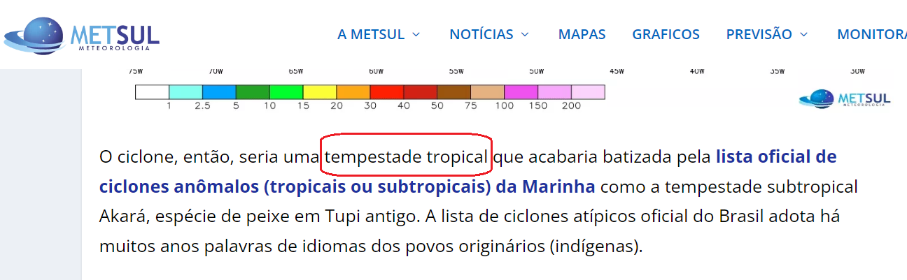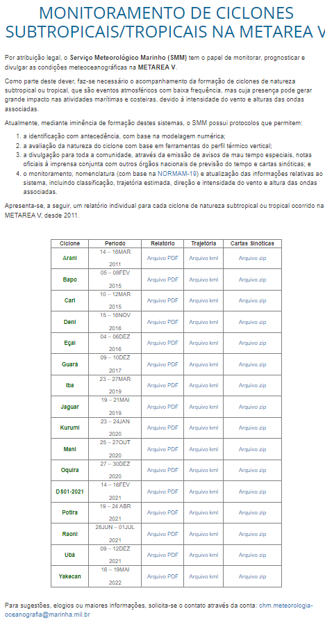 Rodolfo Alves Posted May 21, 2022 at 07:04 PM Share Posted May 21, 2022 at 07:04 PM NOVO TÓPICO PARA MONITORAMENTO E PREVISÃO DE CICLONES SUBTROPICAIS/TROPICAIS NO ATLÂNTICO SUL (2022 EM DIANTE) (Editado em razão da atualização da lista de nomes) PARA ACESSO AOS ANTIGOS TÓPICOS (clicar em cima): 2013-2016 2016-2022 (até Yakecan) RELAÇÃO DE TODOS OS CICLONES SUBTROPICAIS/TROPICAIS NO ATLÂNTICO SUL DESDE 2004 - SEMPRE ATUALIZADO (Clique Aqui) O MONITORAMENTO OFICIAL É FEITO PELO CHM (CENTRO DE HIDROGRAFIA DA MARINHA). ESTE É O ÓRGÃO OFICIAL POR DESIGNAR, MONITORAR, NOMEAR E ALERTAR SOBRE CICLONES SUBTROPICAIS E TROPICAIS NO ATLÂNTICO SUL, DENTRO DA SUA ÁREA DE RESPONSABILIDADE CONFORME MAPA ABAIXO: DE ACORDO COM AS NORMAS DO CHM (NORMAM-19), OS CICLONES SUBTROPICAIS E TROPICAIS PODERÃO SER CLASSIFICADOS DA SEGUINTE FORMA PELO CHM: CICLONE TROPICAL - Baixa Pressão com Núcleo quente sem associação frontal, com convecção profunda e circulação em torno de um centro bem definido: - Depressão Tropical (Ventos Inferiores a 63km/h) - Tempestade Tropical (Ventos entre 63 e 118km/h) - Furacão (Ventos acima de 118km/h) CICLONE SUBTROPICAL - Baixa pressão não frontal com características híbridas, ventos afastados do centro e convecção menos simétrica - Depressão Subtropical (Ventos Inferiores a 63km/h) - Tempestade Subtropical (Ventos entre 63-118km/h) PERÍODO DE FORMAÇÃO: CICLONES SUBTROPICAIS/TROPICAIS PODEM OCORRER A QUALQUER MOMENTO DO ANO, E NÃO HÁ REGRA DE TEMPORADA COMO EM OUTRAS BACIAS. PARA ORGANIZAÇÃO DO BAZ, ADOTAREMOS AS DATAS DE TEMPORADAS DE CICLONES EM OUTRAS BACIAS DO HEMISFÉRIO SUL: TEMPORADA COMEÇA EM 1 DE JULHO DE UM ANO E TERMINA EM 30 DE JUNHO DO ANO SEGUINTE. LISTA DE NOMES Sempre que um Ciclone Subtropical ou Tropical atingir ventos de 63km/h (Tempestade Subtropical ou Tropical) será nomeado, conforme lista elaborada pelo CHM. Essa nomeação assim que adotada, torna-se o nome oficial do sistema a ser usado internacionalmente. A primeira lista de nomes foi usada entre 2011 e maio de 2022. Em 01/03/2023, o CHM elaborou uma nova lista para nomear ciclones subtropicais e tropicais. Esta lista possui 32 nomes. Em caso de ciclones significativos, o CHM poderá retirar nomes da lista original. Abaixo segue a ordem da lista de nomes a ser usada para os próximos sistemas subtropicais/tropicais: 1 - Akará (Espécie de peixe) 2 - Biguá (Ave marinha) 3 - Caiobá (Habitante da mata) 4 - Endy (Luz do fogo) 5 - Guarani (Guerreiro) 6 - Iguaçú (Rio grande) 7 - Jaci (Lua) 8 - Kaeté (Mata virgem) 9 - Maracá (Instrumento indígena) 10 - Okanga (Madeira) 11 - Poti (Camarão) 12 - Reri (Ostra) 13 - Sumé (Deus da agricultura) 14 - Tupã (Deus do trovão) 15 - Upaba (Lagoa) 16 - Ybatinga (Nuvem 17 - Aratu (Caranguejo) 18 - Buri (Palmeira) 19 - Caiçara (Cerca) 20 - Esapé (Iluminar) 21 - Guaí (Pássaro) 22 - Itã (Concha) 23 - Juru (Foz) 24 - Katu (Bondade) 25 - Murici (Arbusto do cerrado) 26 - Oryba (Felicidade) 27 - Peri (Planta d'água) 28 - Reia (Realeza) 29 - Samburá (Cesto indígena) 30 - Taubaté (Pedras altas) 31 - Uruana (Tartaruga do mar) 32 - Ytu (Cachoeira) 1 1 Quote Link to comment Share on other sites More sharing options...