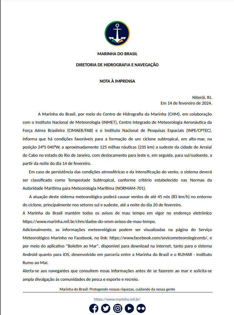 Rodolfo Alves Posted February 14, 2024 at 07:53 PM Author Share Posted February 14, 2024 at 07:53 PM Em 14/02/2024 em 13:02, Rodolfo Alves disse: CENTRO DE HIDROGRAFIA DA MARINHA (CHM) ACABA DE EMITIR UM AVISO PARA A POSSIBILIDADE DE FORMAÇÃO DE CICLONE SUBTROPICAL OU TROPICAL AMANHÃ A NOITE CHM EMITE NOVO AVISO DUAS HORAS DEPOIS DO ÚLTIMO, E RETIRA A POSSIBILIDADE DE CICLONE TROPICAL 3 Quote Link to comment Share on other sites More sharing options...