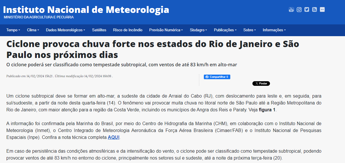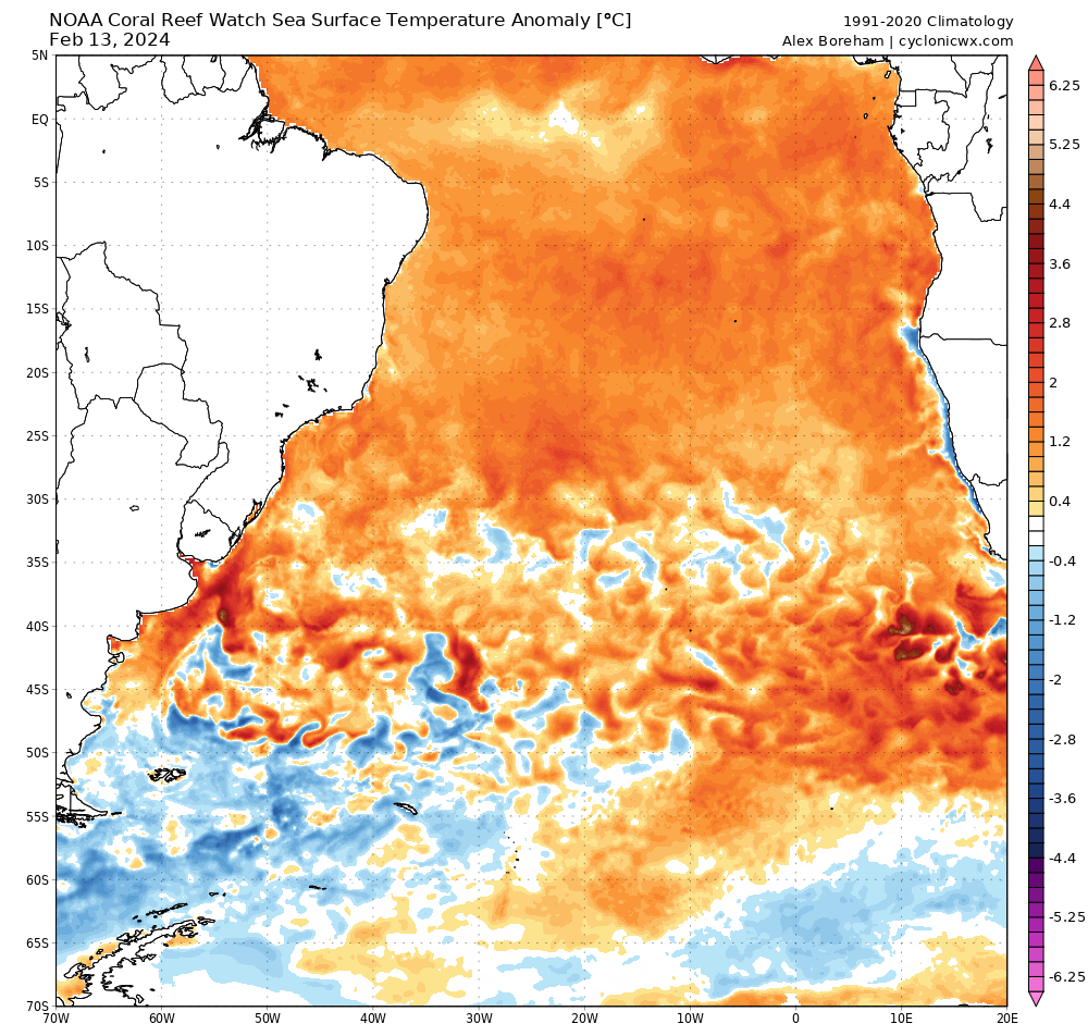André L P Souza Posted February 14, 2024 at 11:18 PM Share Posted February 14, 2024 at 11:18 PM (edited) Exatos 20 anos depois da formação do furacão Catarina, temos a possibilidade clara da formação de um novo ciclone subtropical. A costa do Rio de Janeiro está com temperatura marítima em torno de 27° C, o suficiente para a incidência desta tormenta. Há alerta de inundações, deslizamentos, queda de árvores e de postes em grande parte do RJ, na serra da Mantiqueira e litoral Norte paulista. Edited February 14, 2024 at 11:19 PM by André L P Souza Correção de erro 3 1 Quote Link to comment Share on other sites More sharing options...